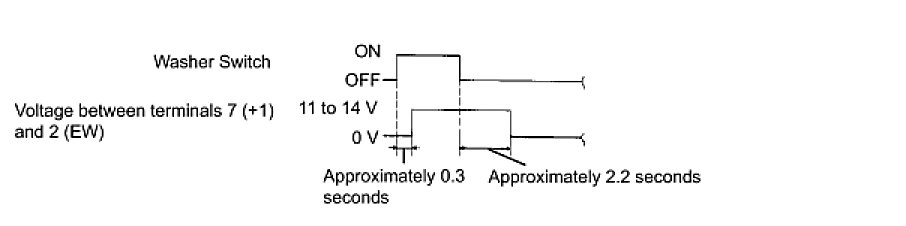 (3) Connect the positive (+) voltmeter terminal to terminal 7 (+1) and the negative (-) voltmeter terminal to terminal 2 (EW). Turn the washer switch on and off, and check the voltage between terminals 7 (+1) and 2 (EW).
