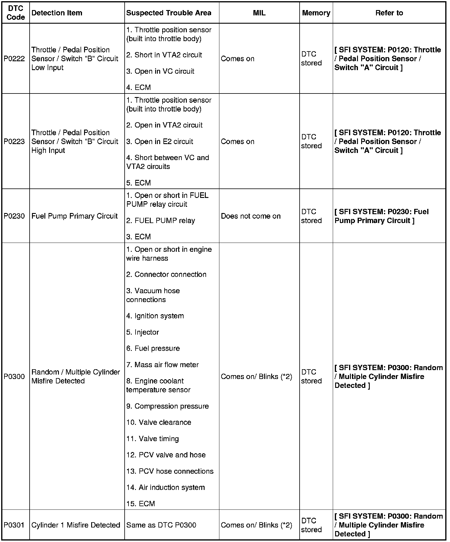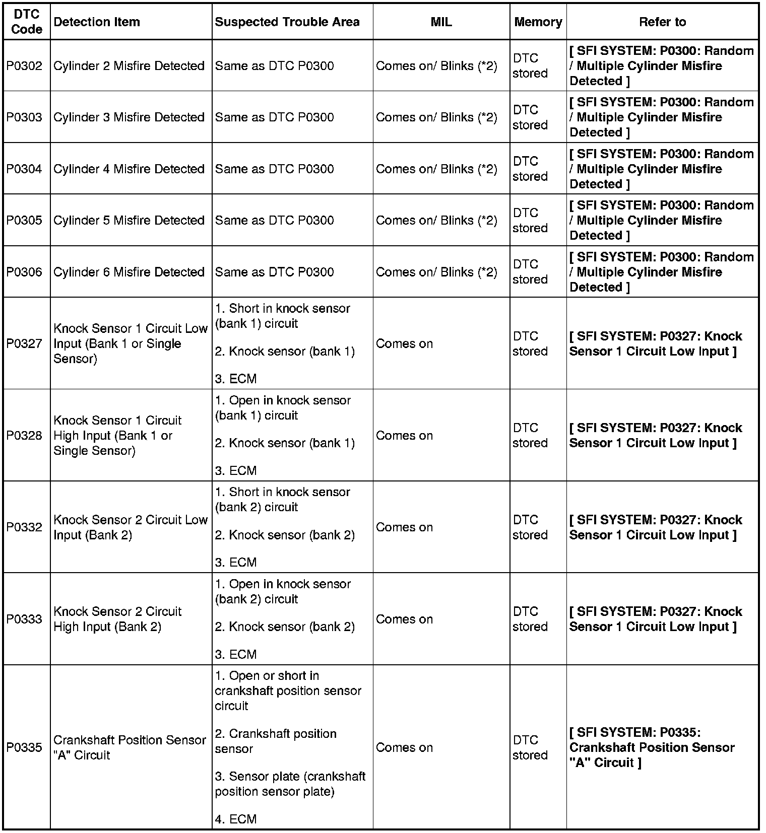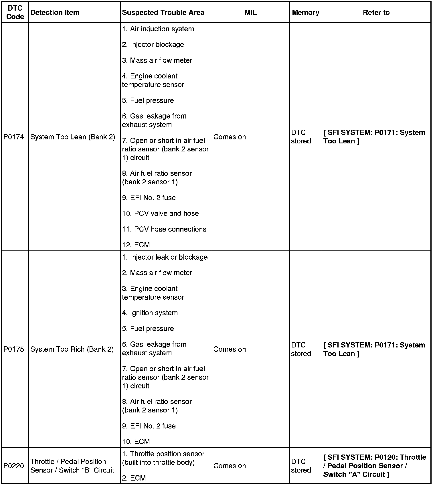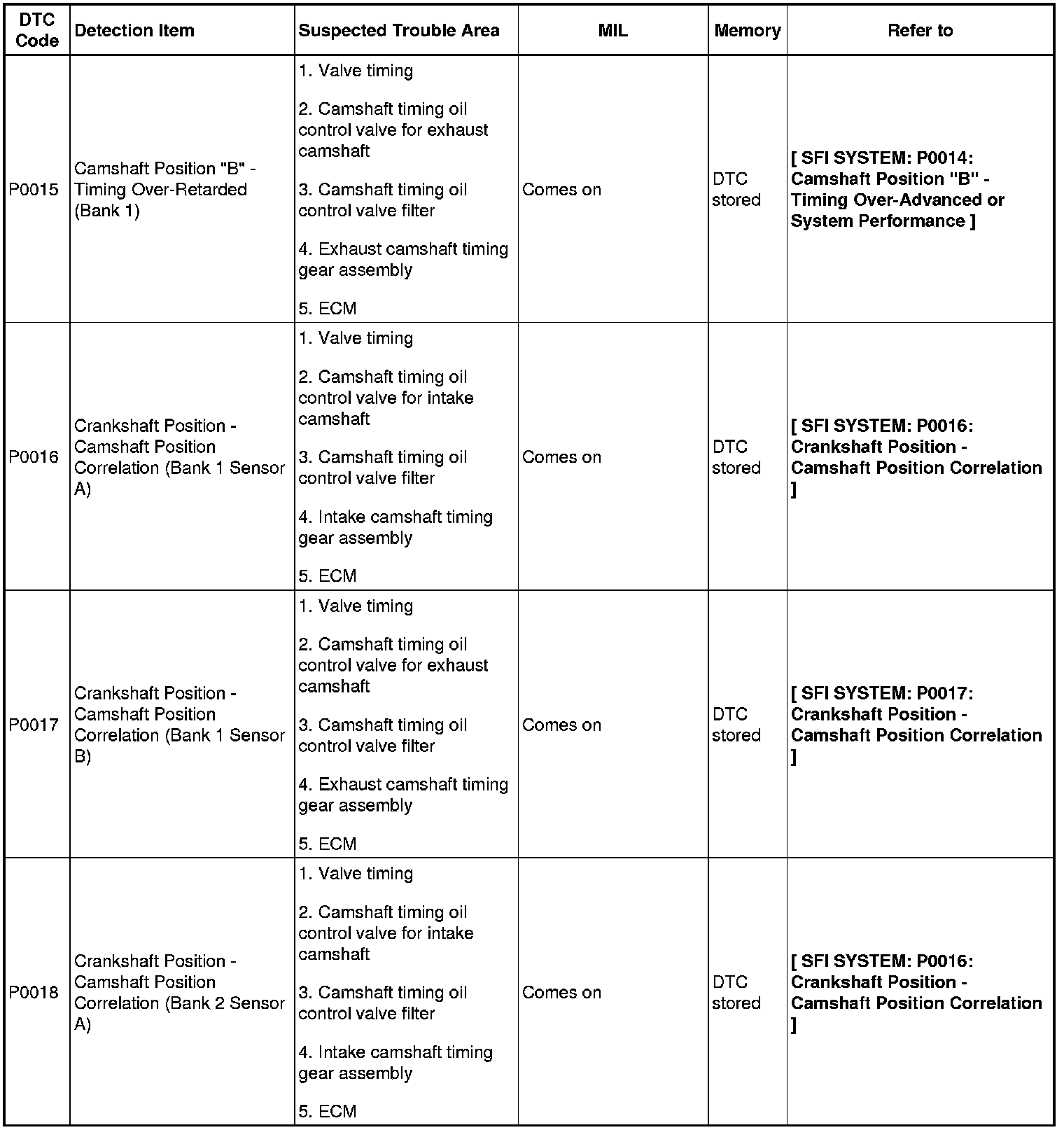 2GR-FE ENGINE CONTROL SYSTEM: SFI SYSTEM: DIAGNOSTIC TROUBLE CODE CHART