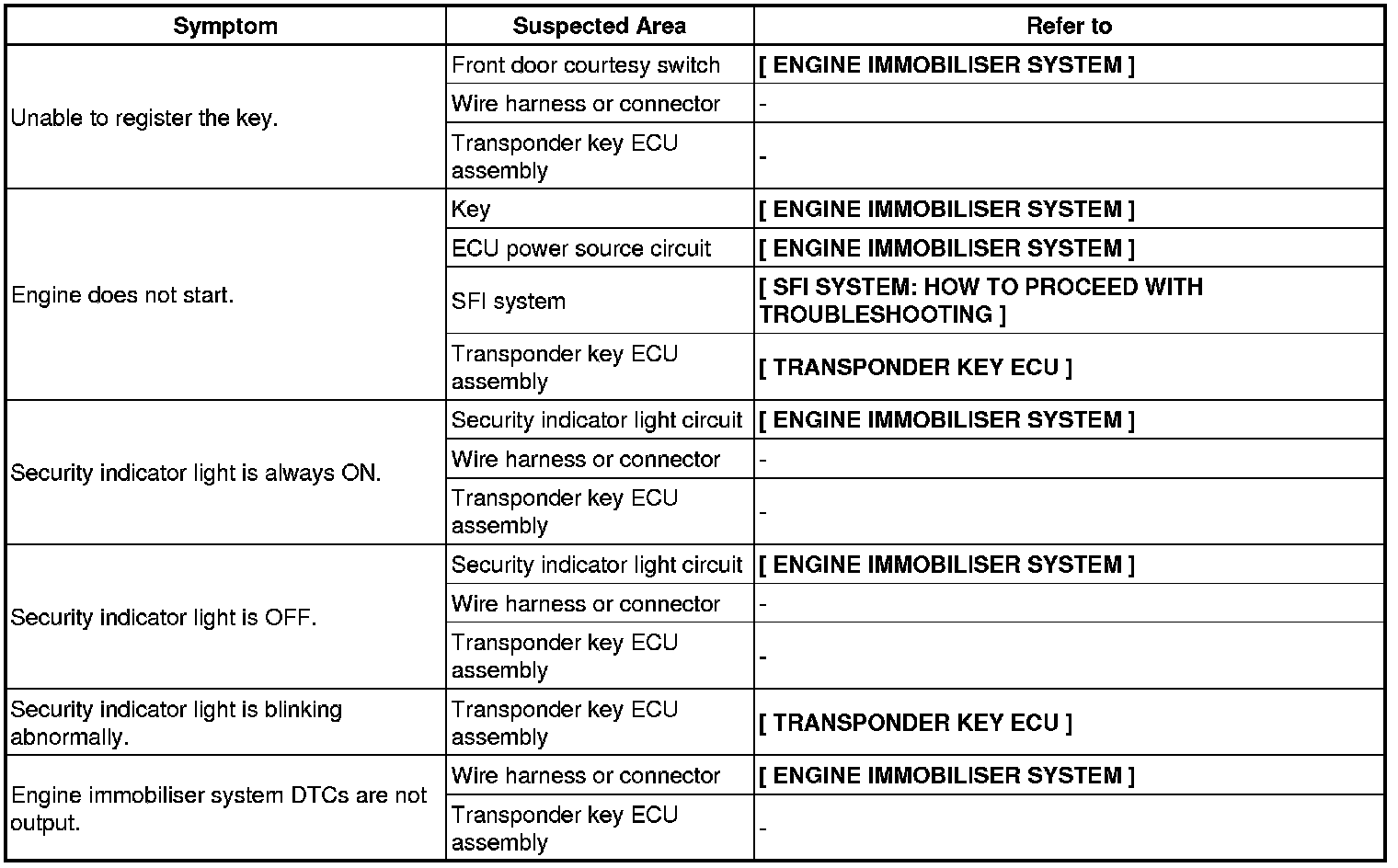 ENGINE IMMOBILISER: ENGINE IMMOBILISER SYSTEM (w/o Smart Key System): PROBLEM SYMPTOMS TABLE