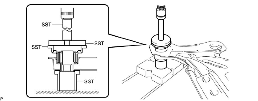 (b) Using SST and a press, install the rear suspension member body mounting front cushion LH to the rear suspension member sub-assembly.