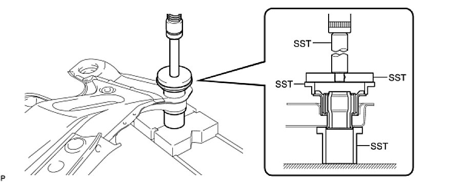 (b) Using SST and a press, install the rear suspension member body mounting rear cushion (LH side) to the rear suspension member sub-assembly.