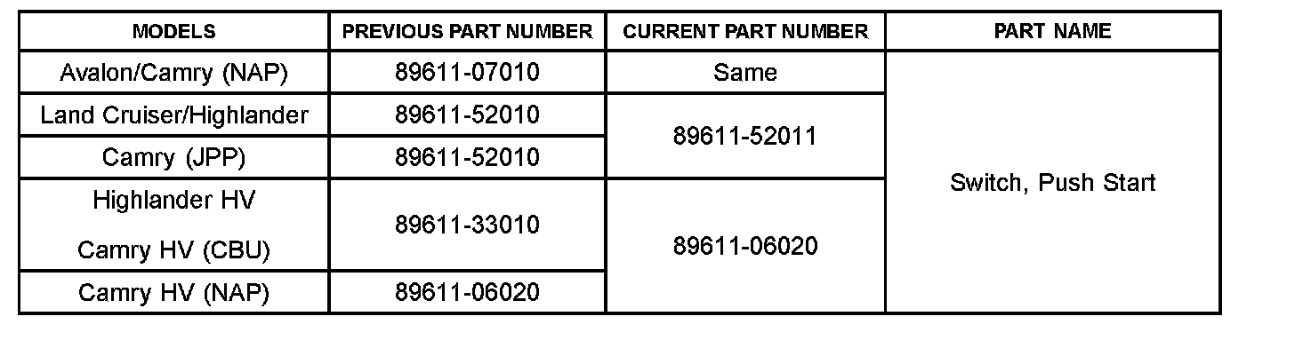 This TSB details the replacement of the "Push Start" switch on vehicles equipped with Smart Key with one of two specific concerns, both of which are intermittent issues that may occur only while starting the engine.