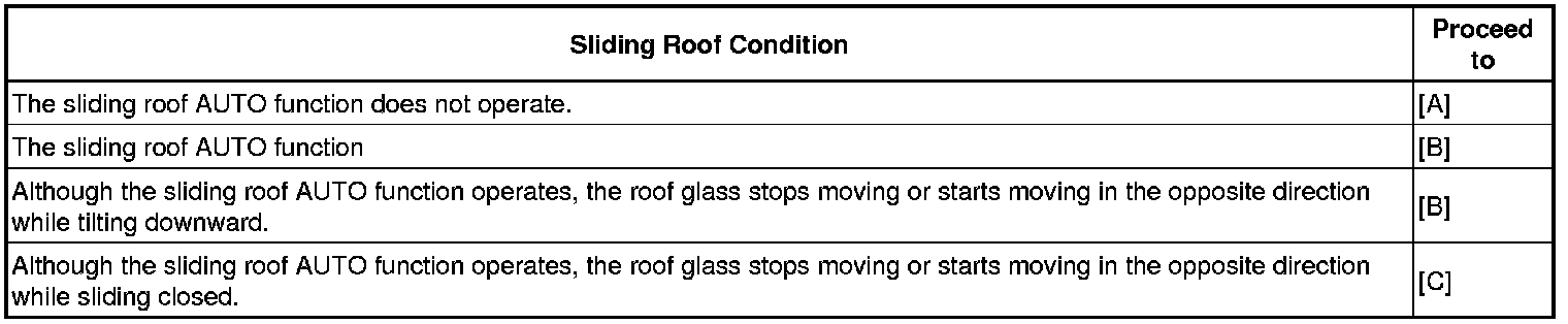 (3) [C] Although the sliding roof AUTO function operates, the roof glass stops moving or starts moving in the opposite direction while sliding closed.