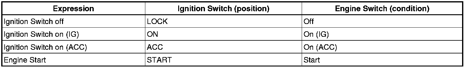 HINT: The type of ignition switch used on this model differs according to the specifications of the vehicle. The expressions listed in the table below are used.