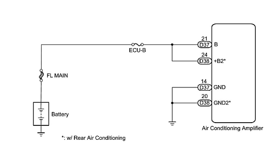 This is the back-up power source circuit for the air conditioning amplifier. Power is supplied even when the ignition switch is turned off and is used for functions such as the diagnostic trouble code memory.