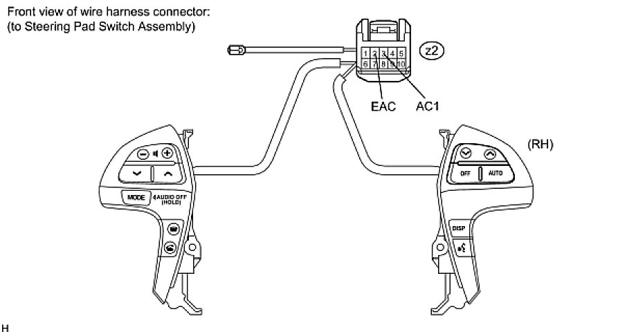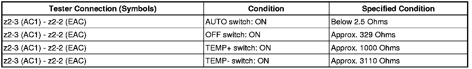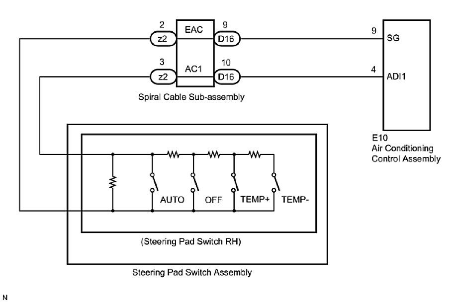 AUTO, OFF, TEMP UP (+), and TEMP DOWN (-) switches are located on the steering pad switch. The resistance of the steering pad switch changes in accordance with switch operation. The air conditioning control assembly outputs voltage to the steering pad switch and reads voltage changes due to the resistance changes that result from switch operation.