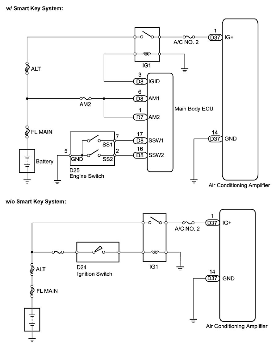 This is the main power source supplied to the air conditioning amplifier when the ignition switch is on (IG). This power source is used for operating components, such as the air conditioning amplifier and servo motors.