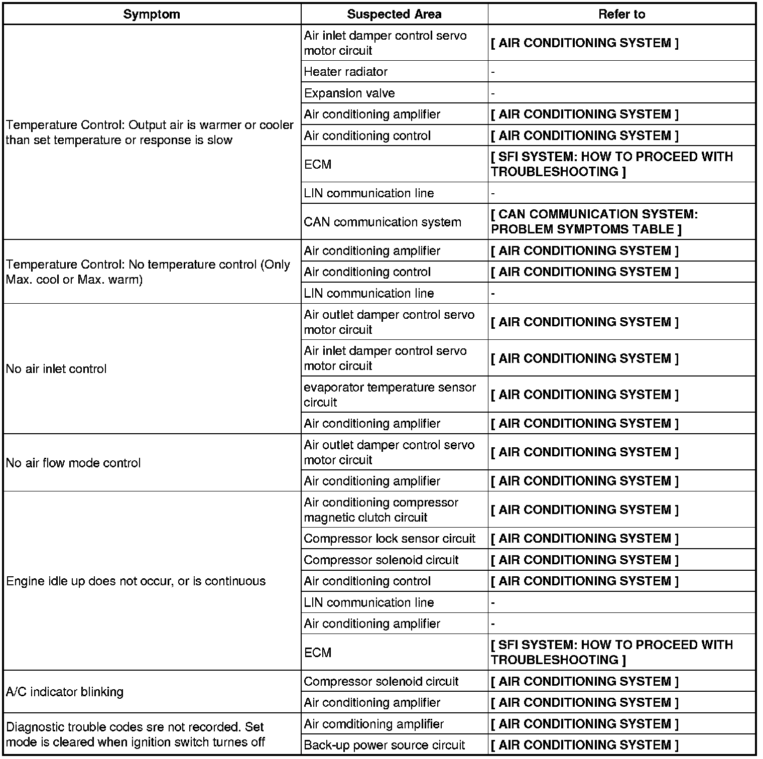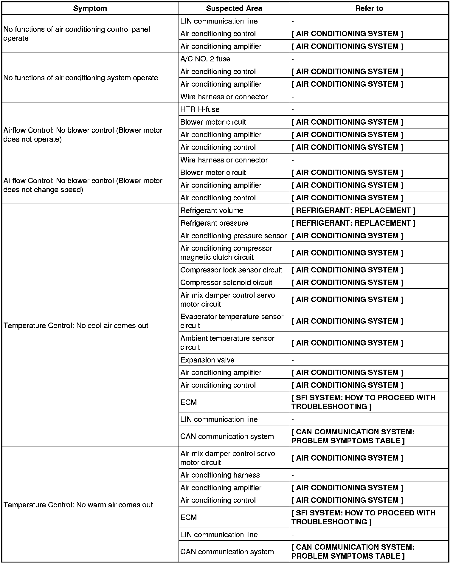 AIR CONDITIONING: AIR CONDITIONING SYSTEM (for Manual Air Conditioning System): PROBLEM SYMPTOMS TABLE