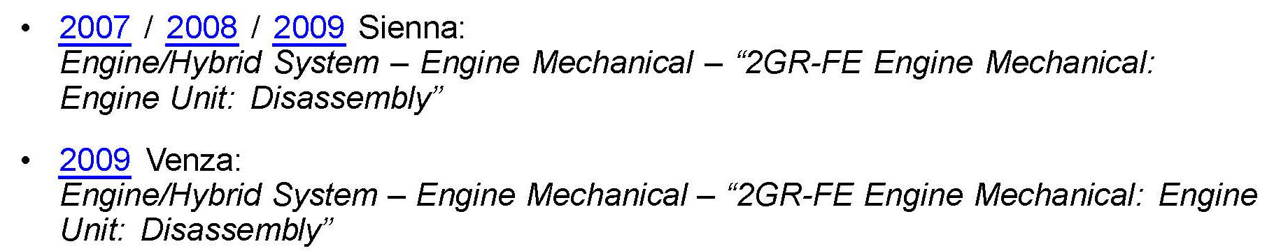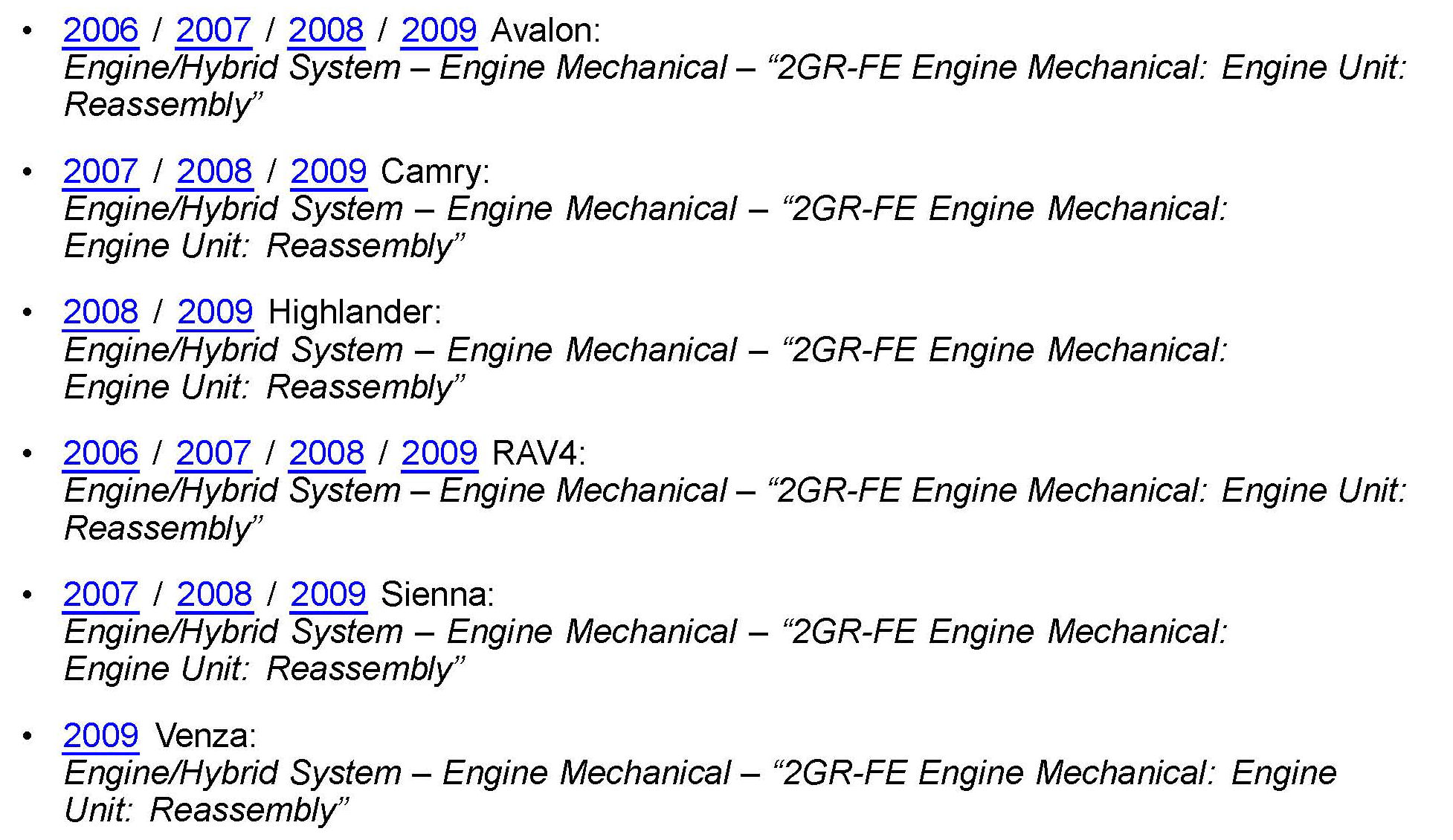 ^ Applicability has been updated to include 2009 model year Venza.