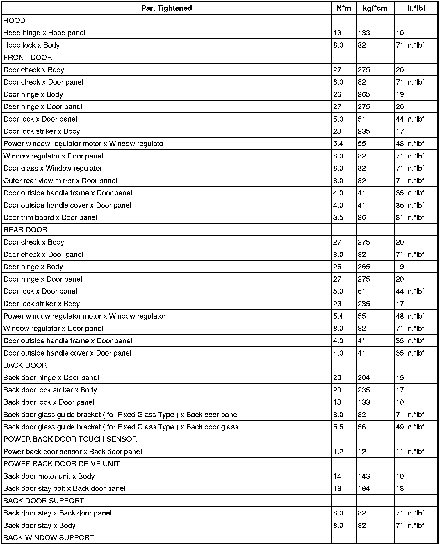 / DOOR: TORQUE SPECIFICATIONS