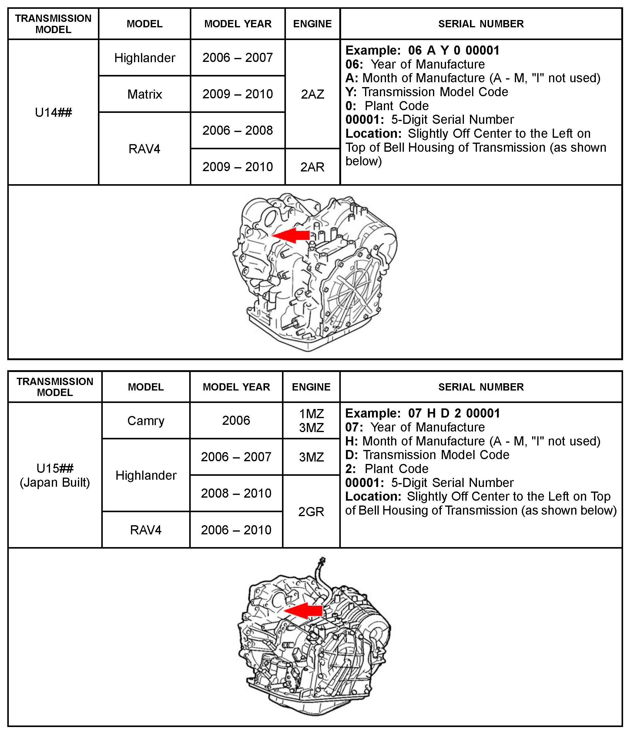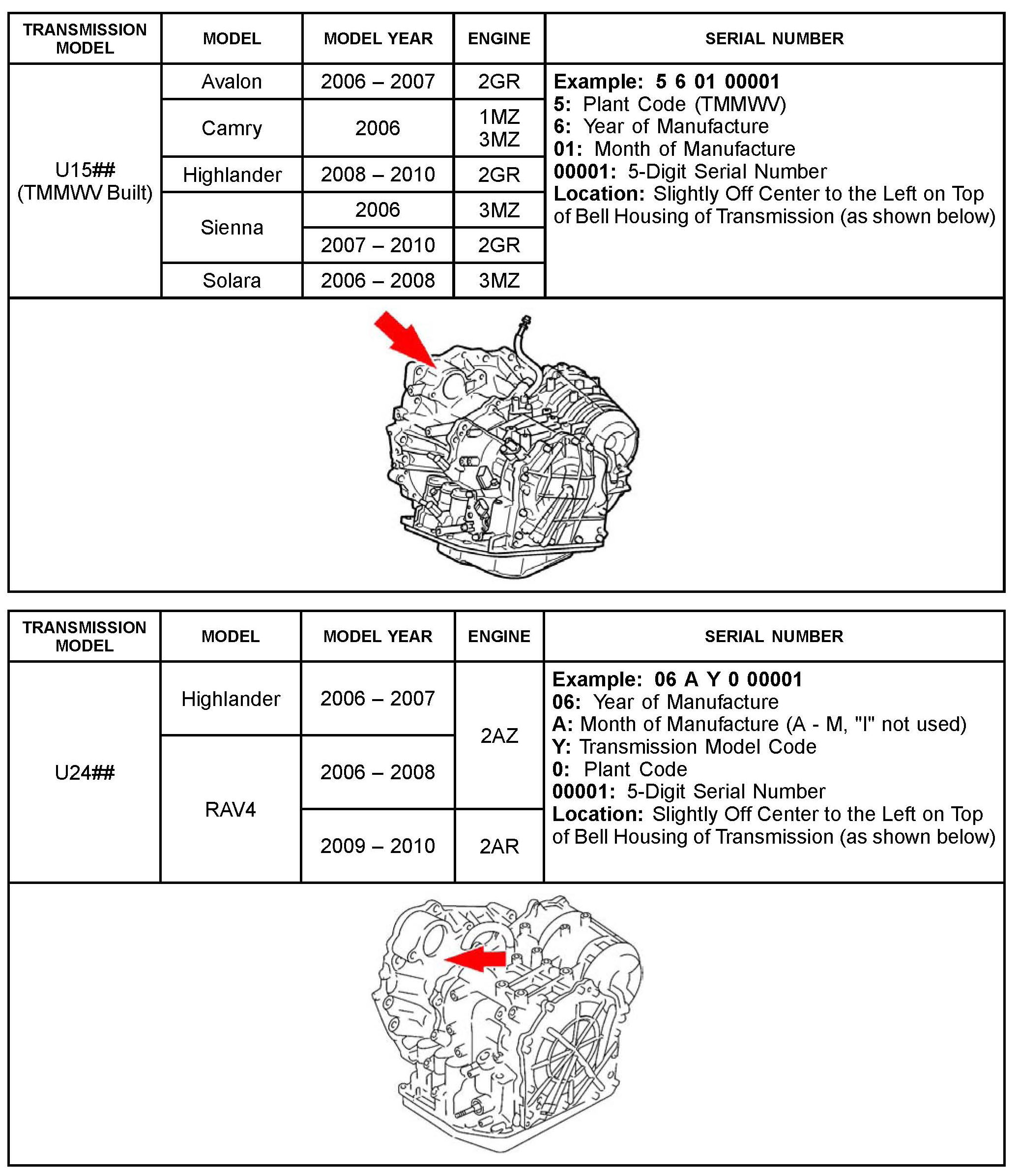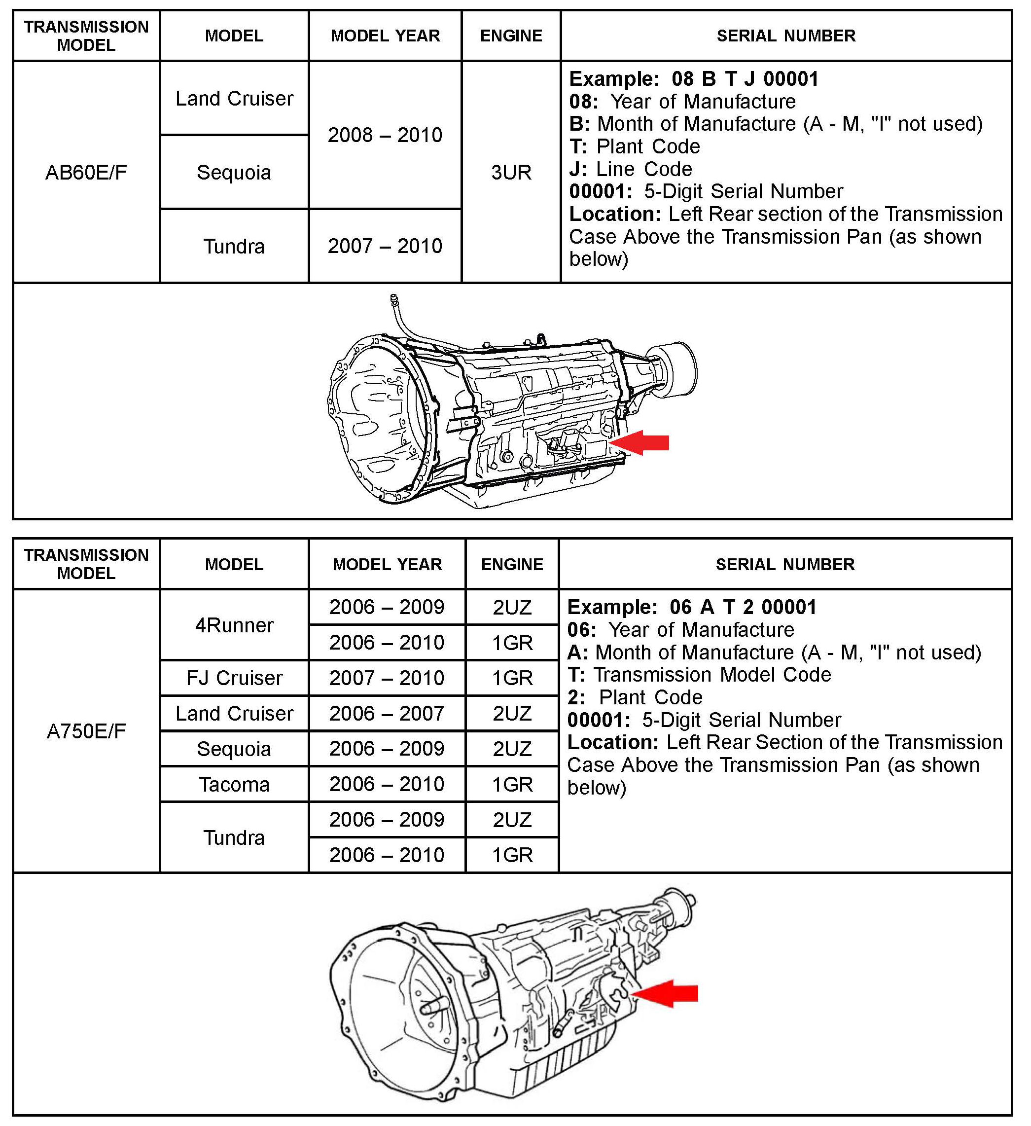 The purpose of this TSB is to assist in the identification and location of serial numbers on 2006 - 2010 model year automatic transmissions.
