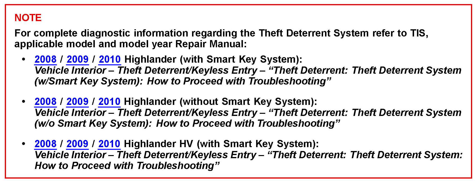 Some 2008 - 2010 model year Japan-built Highlander and Highlander HV vehicles equipped with a factory theft deterrent system may exhibit a condition where the security horn is inappropriately triggered and the vehicle has not been disturbed.