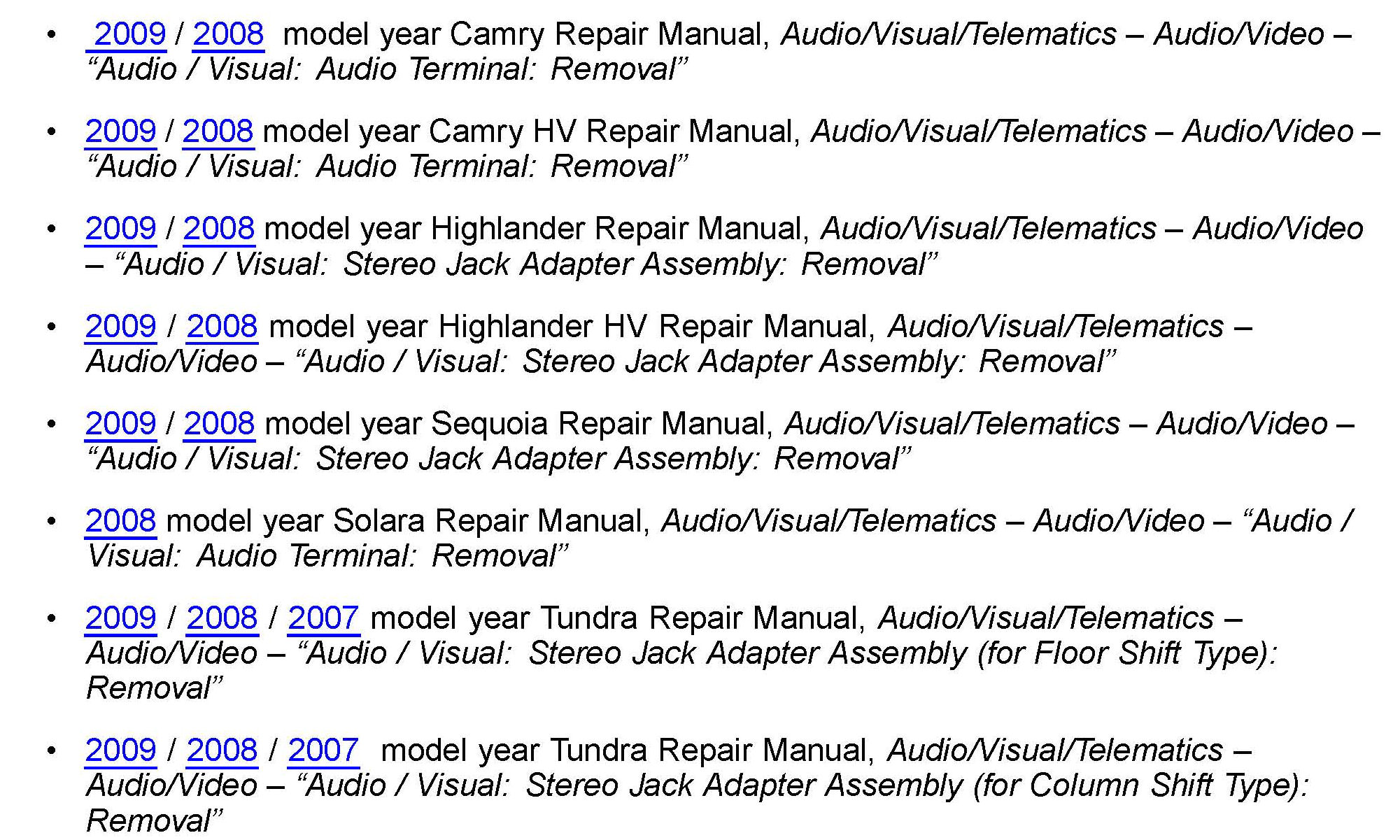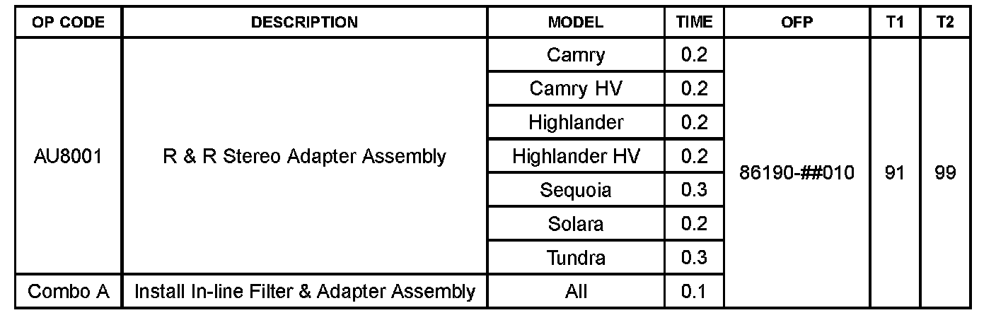 Some customers may notice a noise in the auxiliary mode of their audio system when using an MP3 player or other external audio source connected to the 12V power port on vehicles equipped with the Toyota Navigation System. An improved auxiliary port and in-line filter has been developed to improve this condition. Use the repair procedure below to install the new in-line filter and auxiliary port.