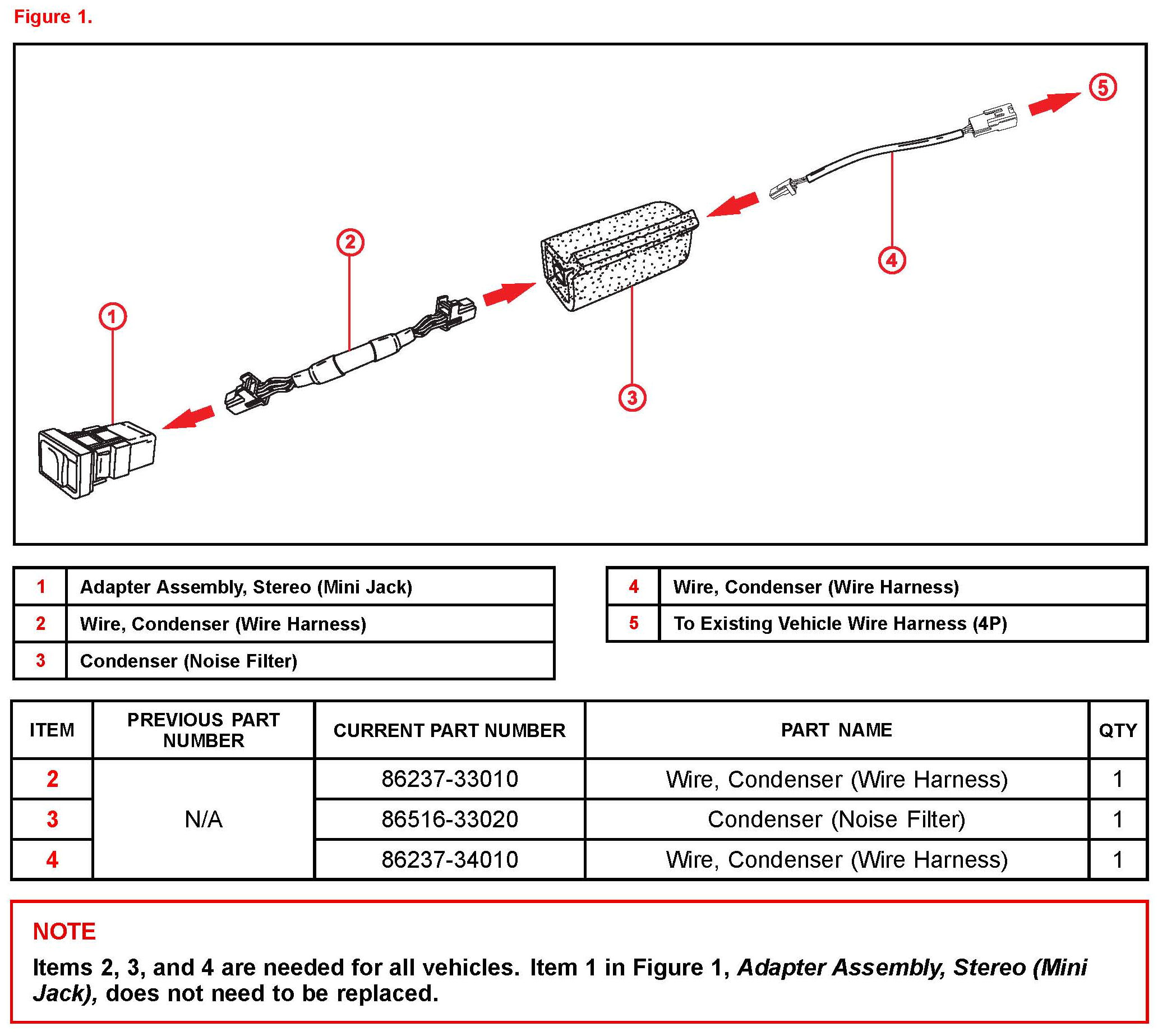 C. Connect wire condenser (wire harness) part number 86237-33010 to the other side of the noise filter.