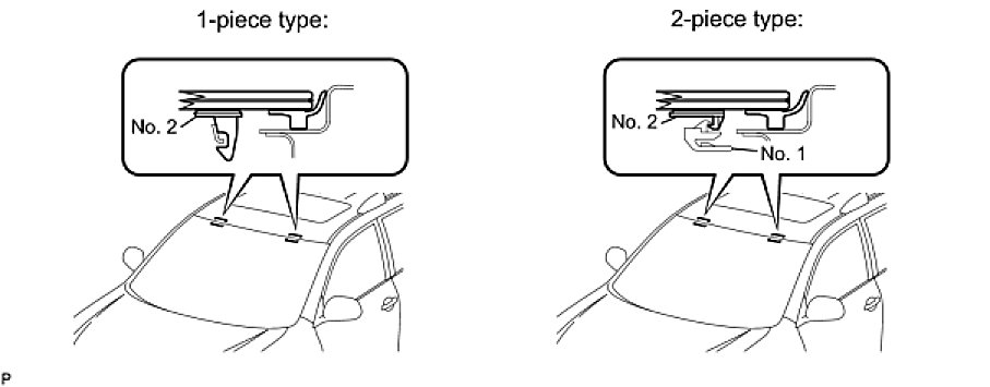 - There are No. 1 and No. 2 stoppers on the windshield glass sub-assembly as shown in the illustration. Be careful not to damage the windshield glass when cutting off the adhesive.