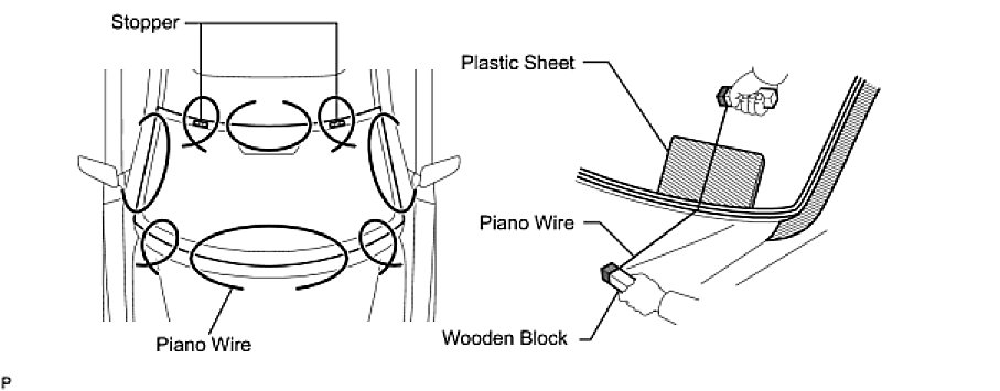 - To prevent the instrument panel from being scratched when removing the windshield glass sub-assembly, place a plastic sheet between the piano wire and instrument panel.
