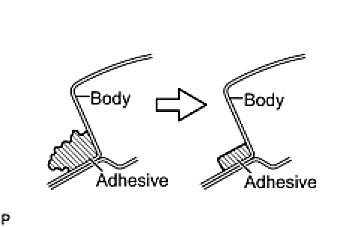 (1) On the contact surfaces of the vehicle body, use a knife to cut away excess adhesive as shown in the illustration.