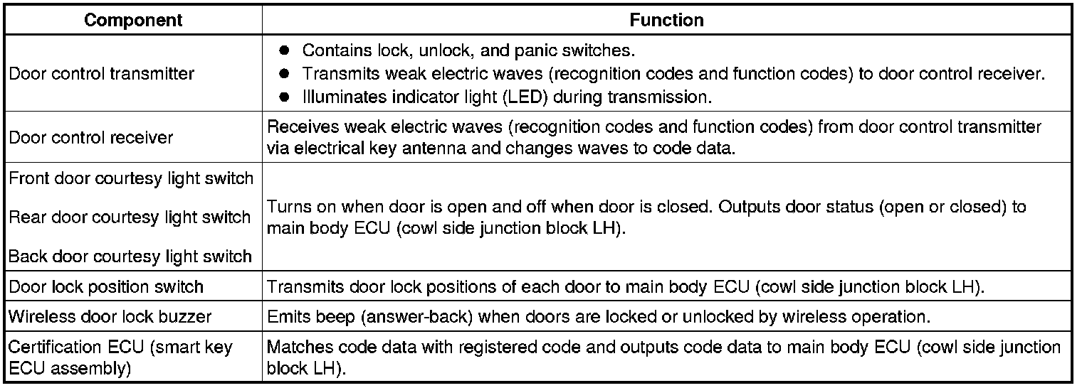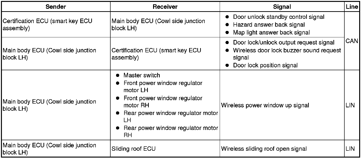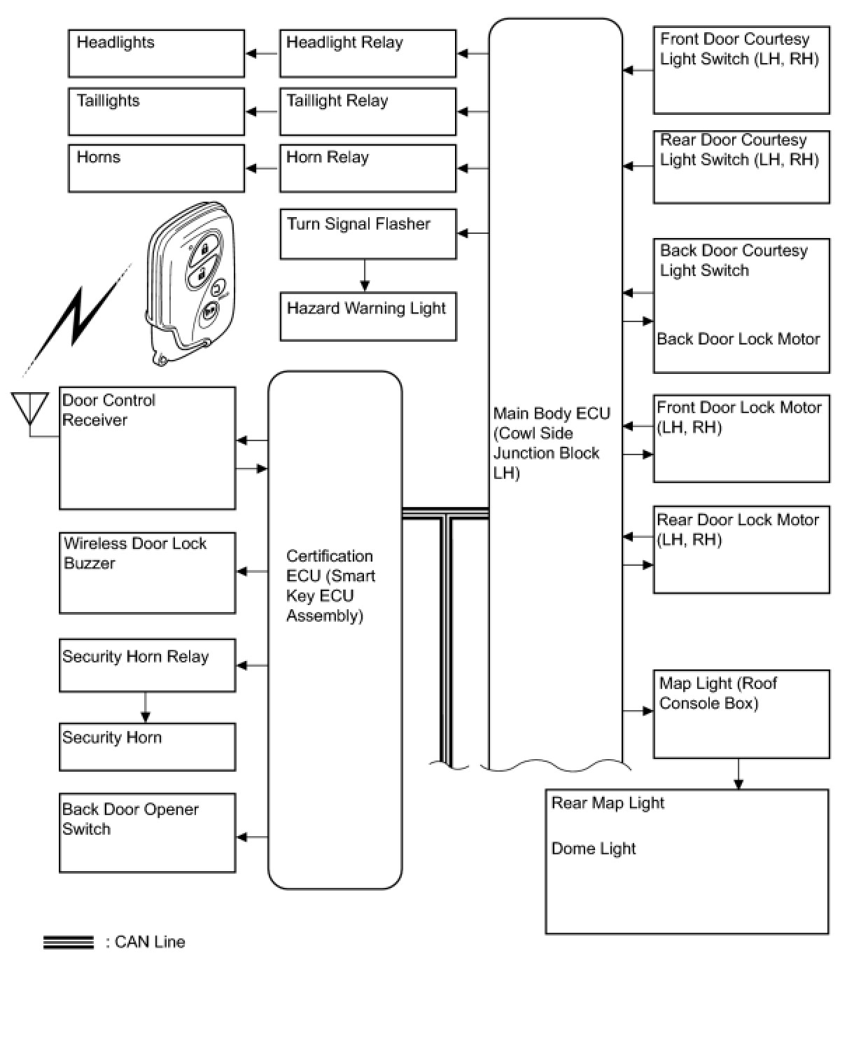 - The certification ECU (smart key ECU assembly) performs the code identification process and the main body ECU (cowl side junction block LH) controls the door lock. A serial data link is provided for communication between the certification ECU (smart key ECU assembly) and main body ECU (cowl side junction block LH).