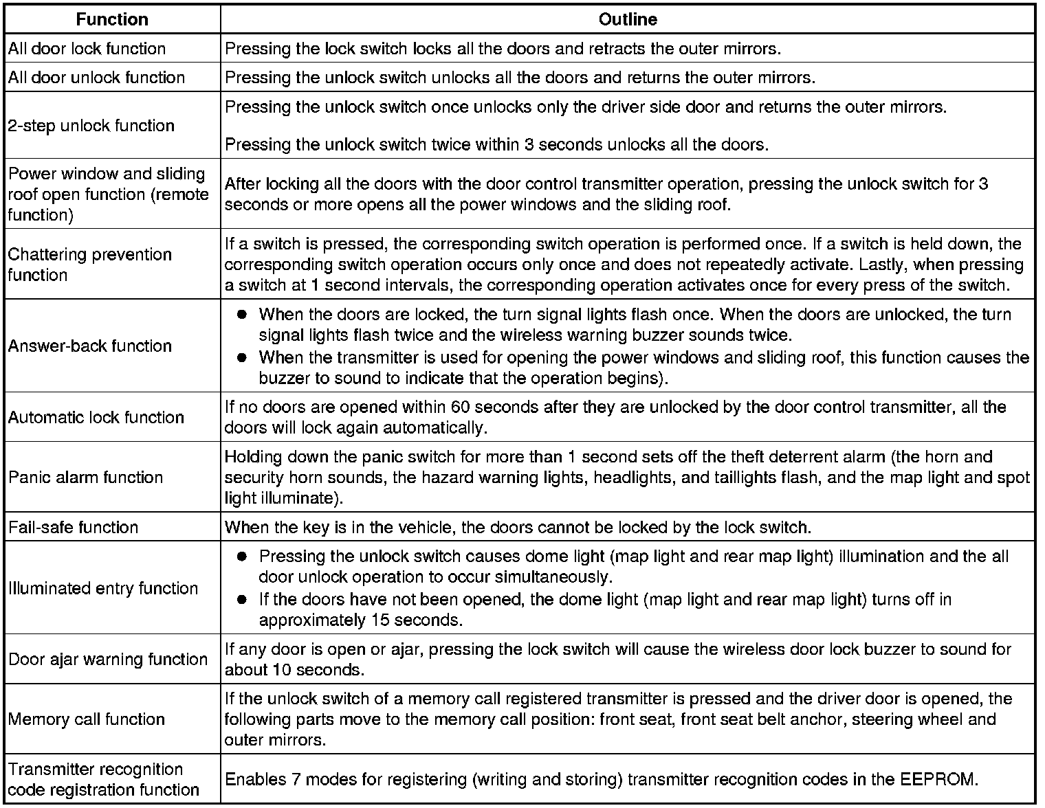 This system lock/unlocks the doors remotely. The wireless door lock control system has the following features: