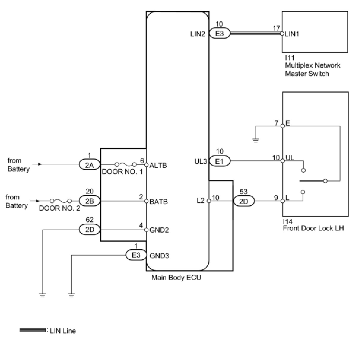 The main body ECU receives switch signals from the multiplex network master switch, and driver side door key cylinder switch signals from the front door lock LH. The main body ECU activates the door lock motor on each door according to these signals.