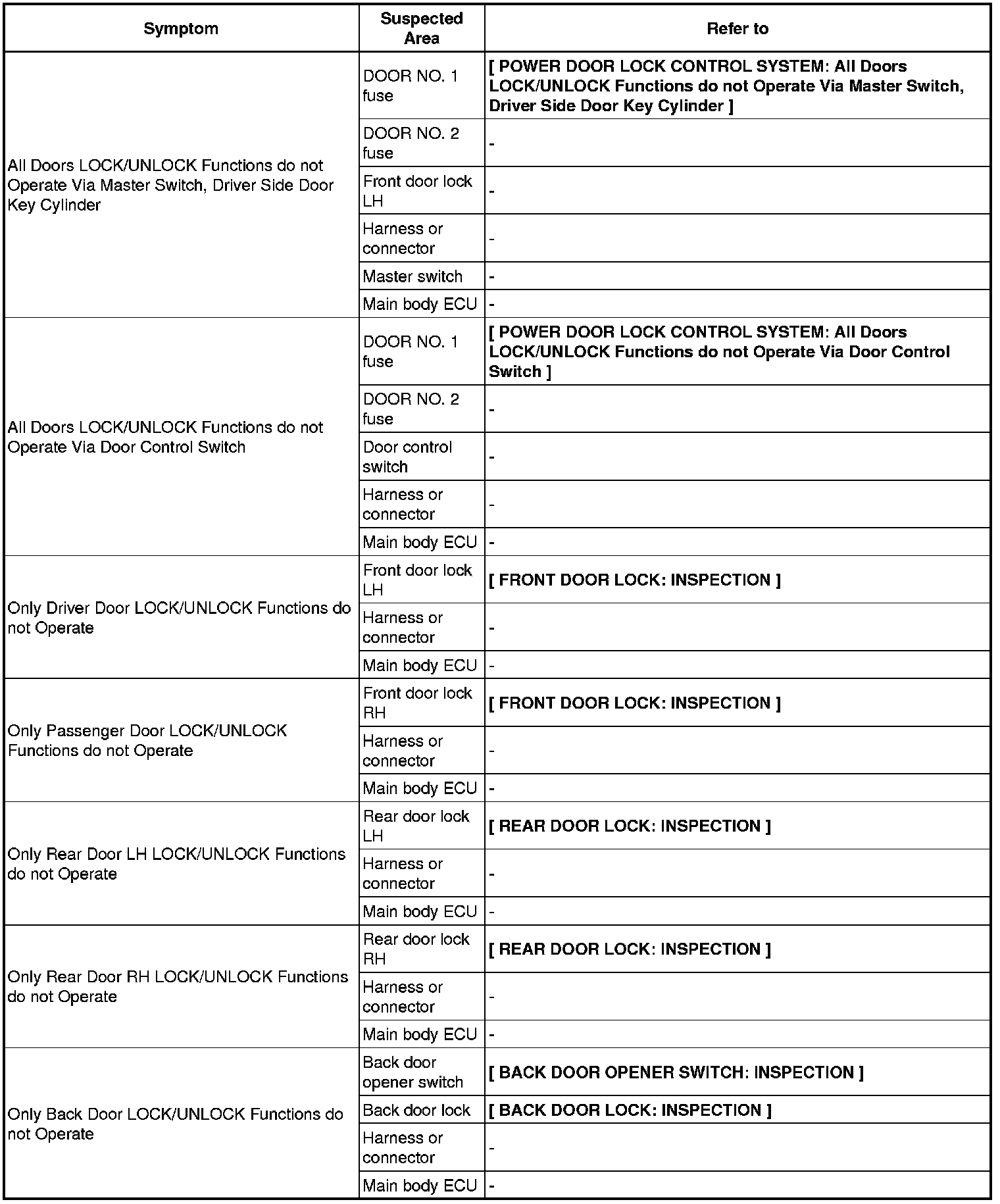 DOOR LOCK: POWER DOOR LOCK CONTROL SYSTEM: PROBLEM SYMPTOMS TABLE