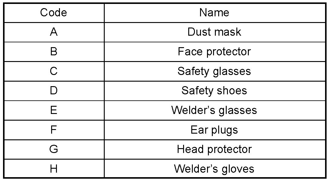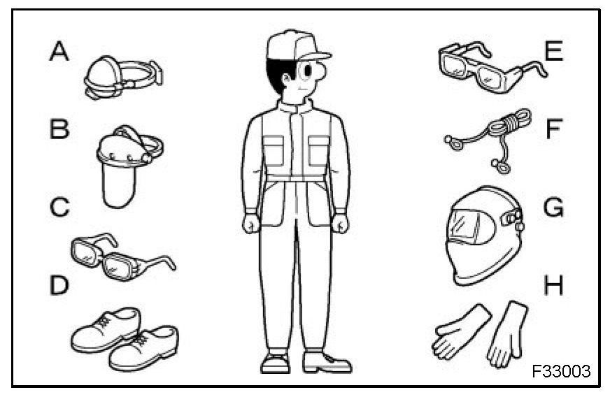 1. In addition to the usual mechanic's wear, cap and safety shoes, the appropriate gloves, head protector, welder's glasses, ear plugs, face protector, dust mask, etc. should be worn as the situation demands.