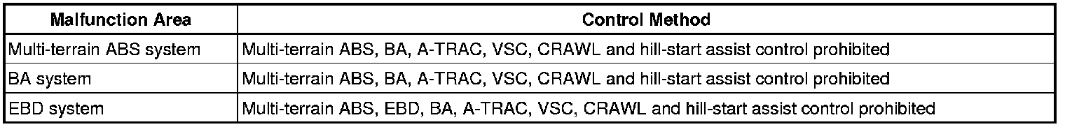 HINT: As for the A-TRAC, VSC, CRAWL and hill-start assist control systems, different systems prohibit different controls according to the malfunctioning part.