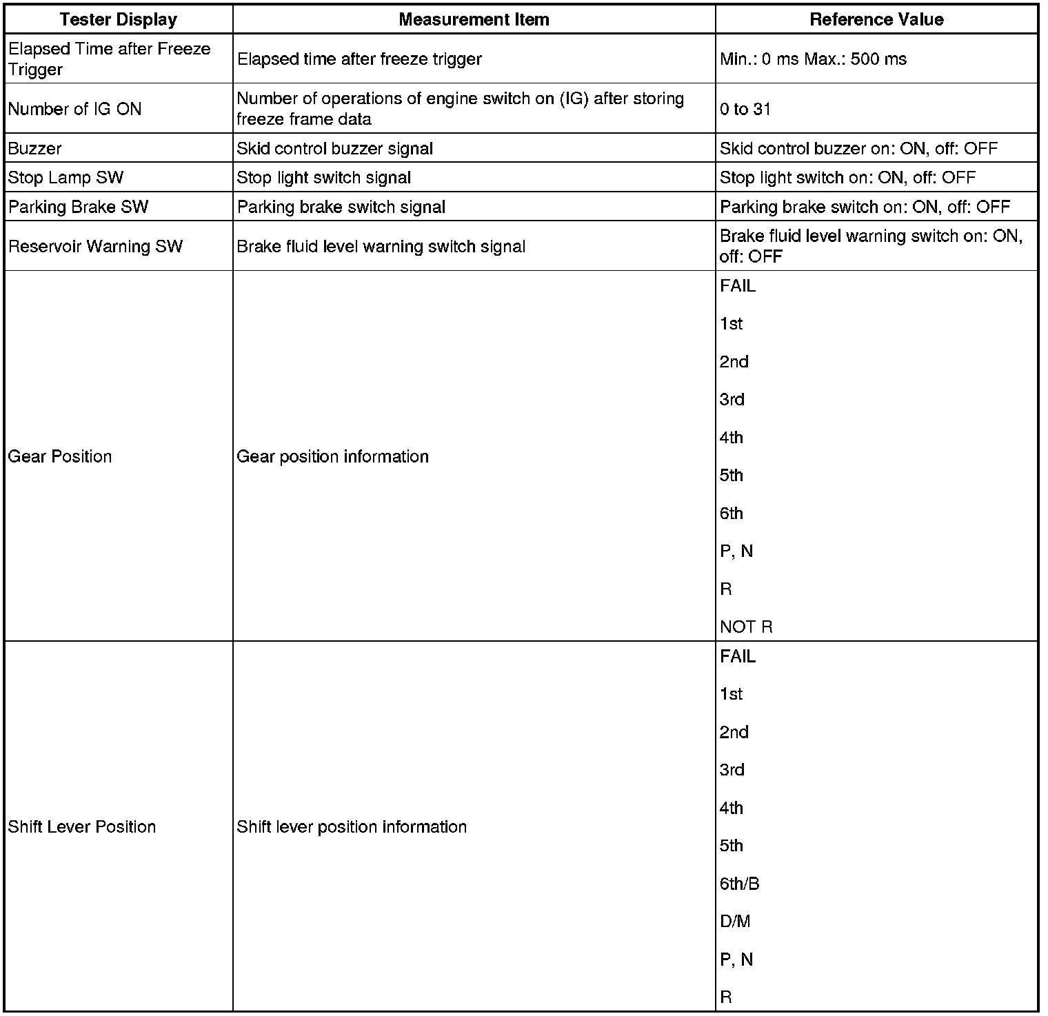 - Freeze frame data at the time a DTC is stored: When the skid control ECU stores data at the time a DTC is stored, no updates will be performed until the data is cleared.