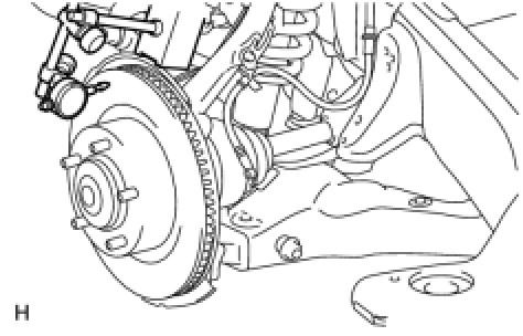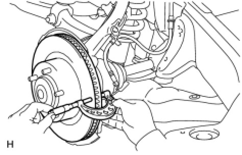 If the runout is more than the maximum, change the installation positions of the disc and axle so that the runout will become minimal. If the runout is more than the maximum even when the installation positions are changed, check the bearing looseness in the axial direction Testing and Inspection and the axle hub runout Testing and Inspection. If the bearing looseness and the axle hub runout are normal, and if the disc thickness is not within the specified range, grind the disc. If the disc thickness is less than the minimum, replace the disc.