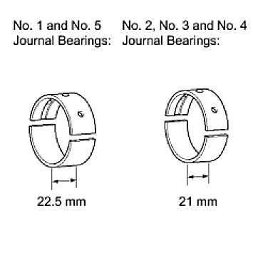 - Main bearings come in widths of 21 mm (0.827 in.) and 22.5 mm (0.886 in.). Install the 22.5 mm (0.886 in.) bearings in the No. 1 and No. 5 cylinder block journal positions with the main bearing caps. Install the 21 mm (0.827 in.) bearings in the No. 2, No. 3 and No. 4 positions.
