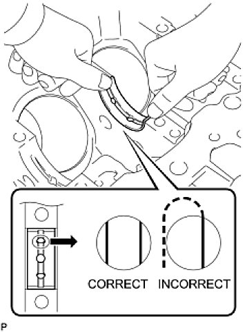 - Both sides of the oil groove in the cylinder block should be visible through the oil feed holes in the bearing. The amount visible on each side of the holes should be equal.