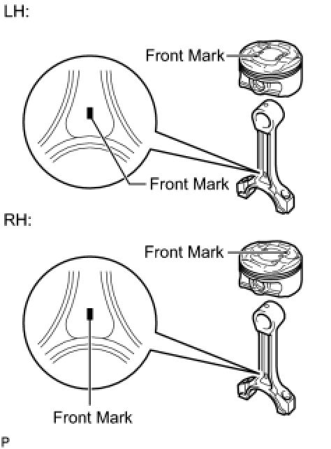 NOTE: For the LH side, perform the assembly so that the front marks of the piston and connecting rod are on the same side. For the RH side, perform the assembly so that the front marks of the piston and connecting rod are on opposite sides.