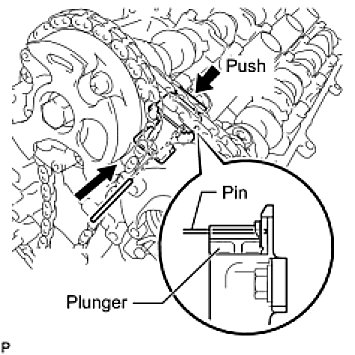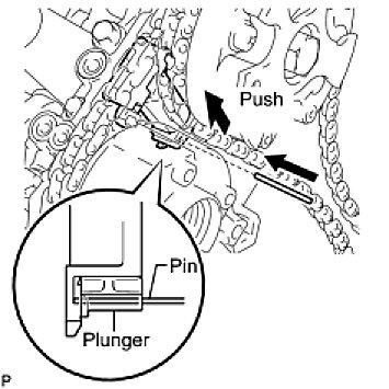 (a) While pushing down the No. 3 chain tensioner, insert a pin of dia1.0 mm (0.0394 in.) into the hole to fix it in place.