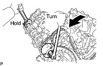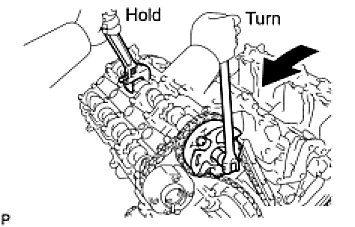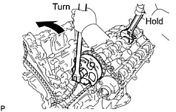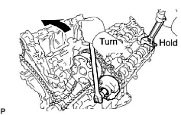 (c) Hold the hexagonal portion of the camshaft with a wrench and loosen the bolt.