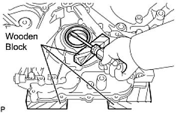 (b) Using a screwdriver and wooden block, pry out the oil seal.
