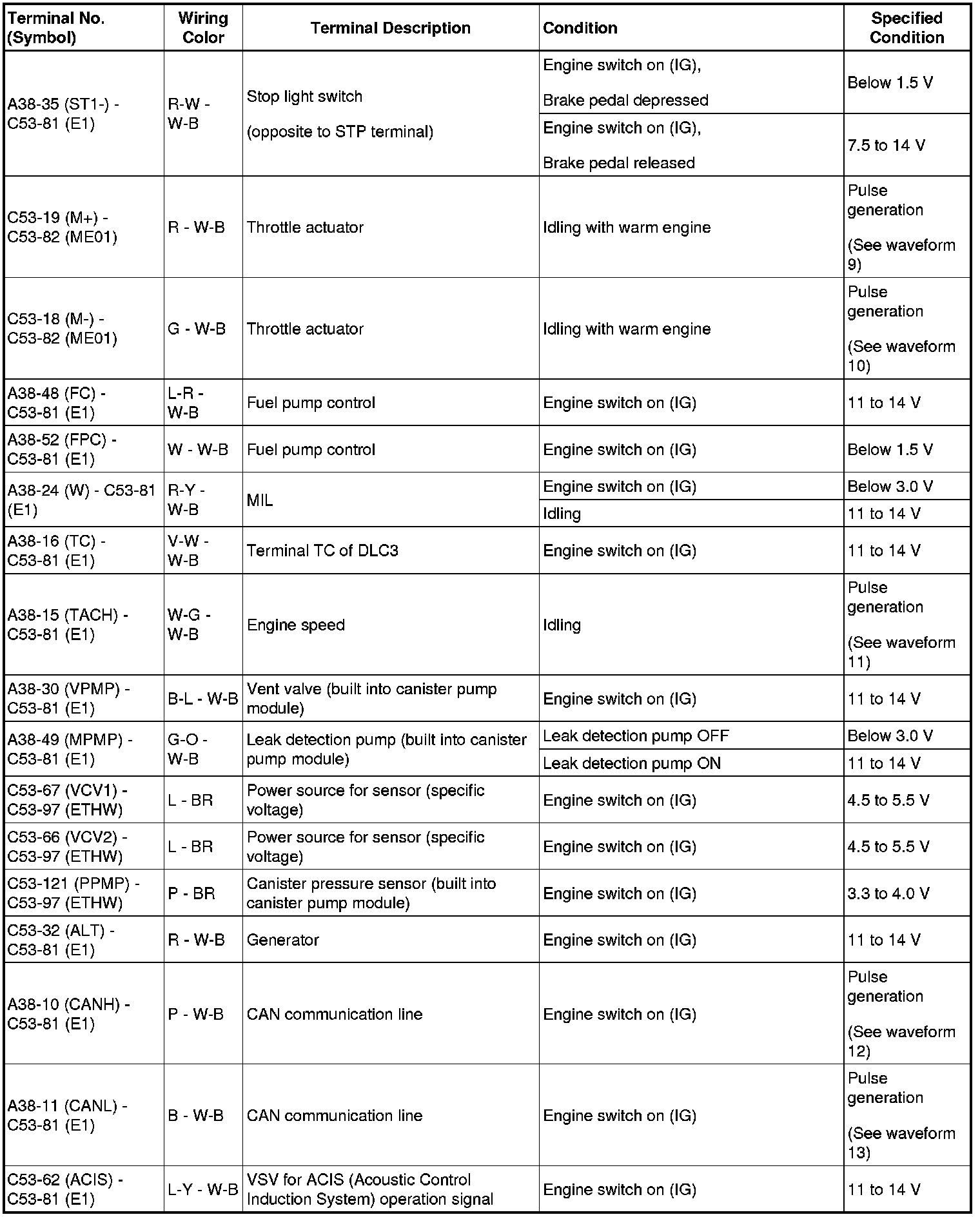 HINT: The standard normal voltage between each pair of ECM terminals is shown in the table below. The appropriate conditions for checking each pair of terminals are also indicated. The result of checks should be compared with the standard normal voltage for that pair of terminals, displayed in the Specified Condition column. The illustration above can be used as a reference to identify the ECM terminal locations.