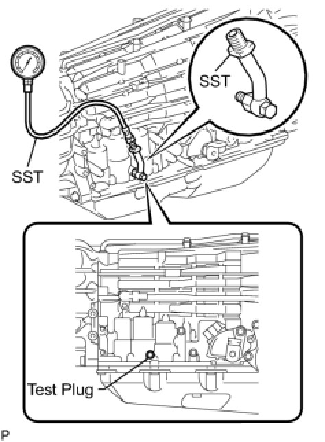 (4) Remove the test plug on the transmission case center right side and connect SST.