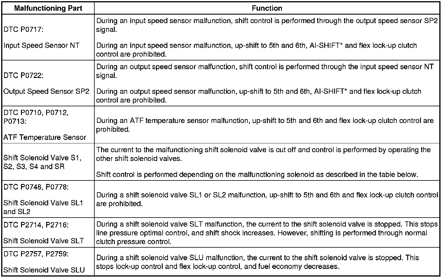 AB60F AUTOMATIC TRANSMISSION / TRANSAXLE: AUTOMATIC TRANSMISSION SYSTEM: FAIL-SAFE CHART