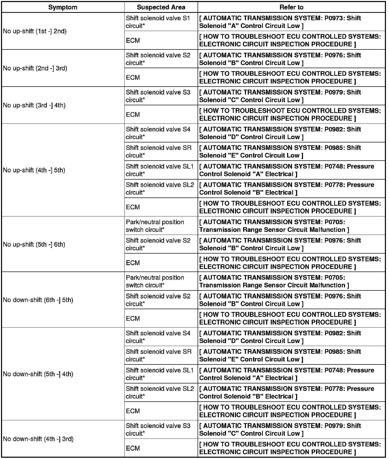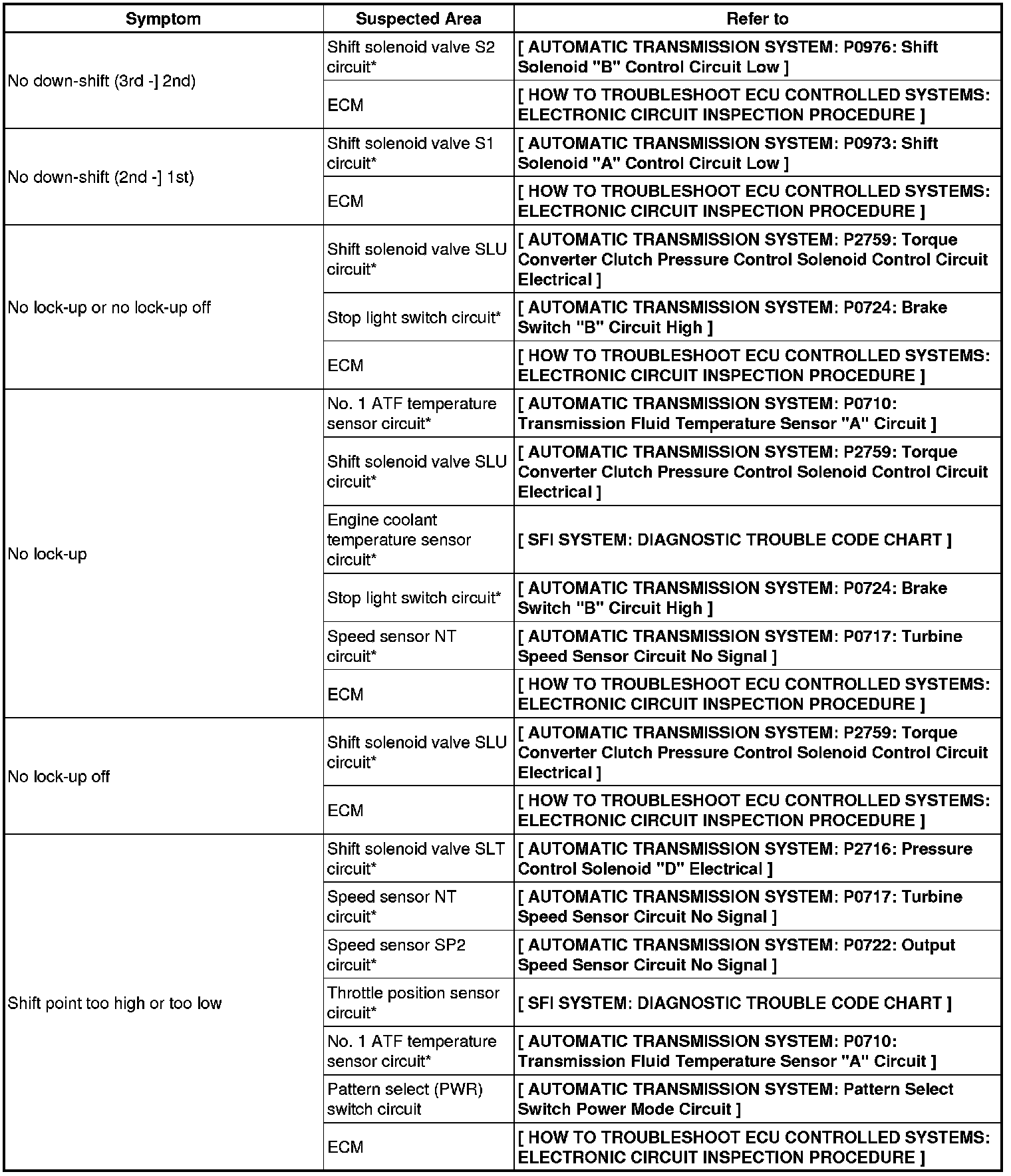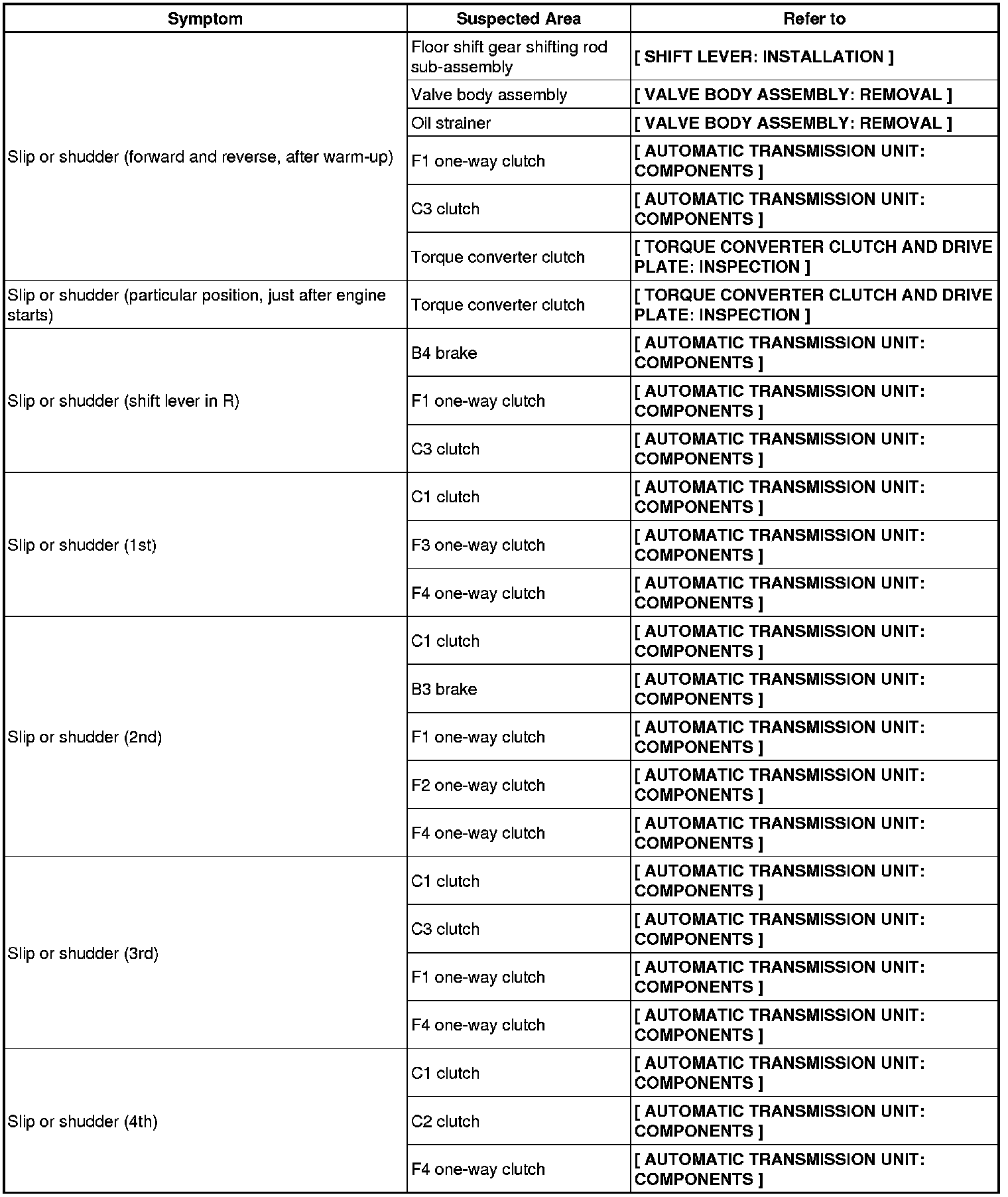 AB60F AUTOMATIC TRANSMISSION / TRANSAXLE: AUTOMATIC TRANSMISSION SYSTEM: PROBLEM SYMPTOMS TABLE