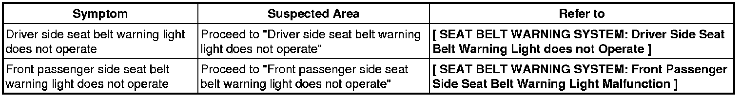 SEAT BELT: SEAT BELT WARNING SYSTEM: PROBLEM SYMPTOMS TABLE