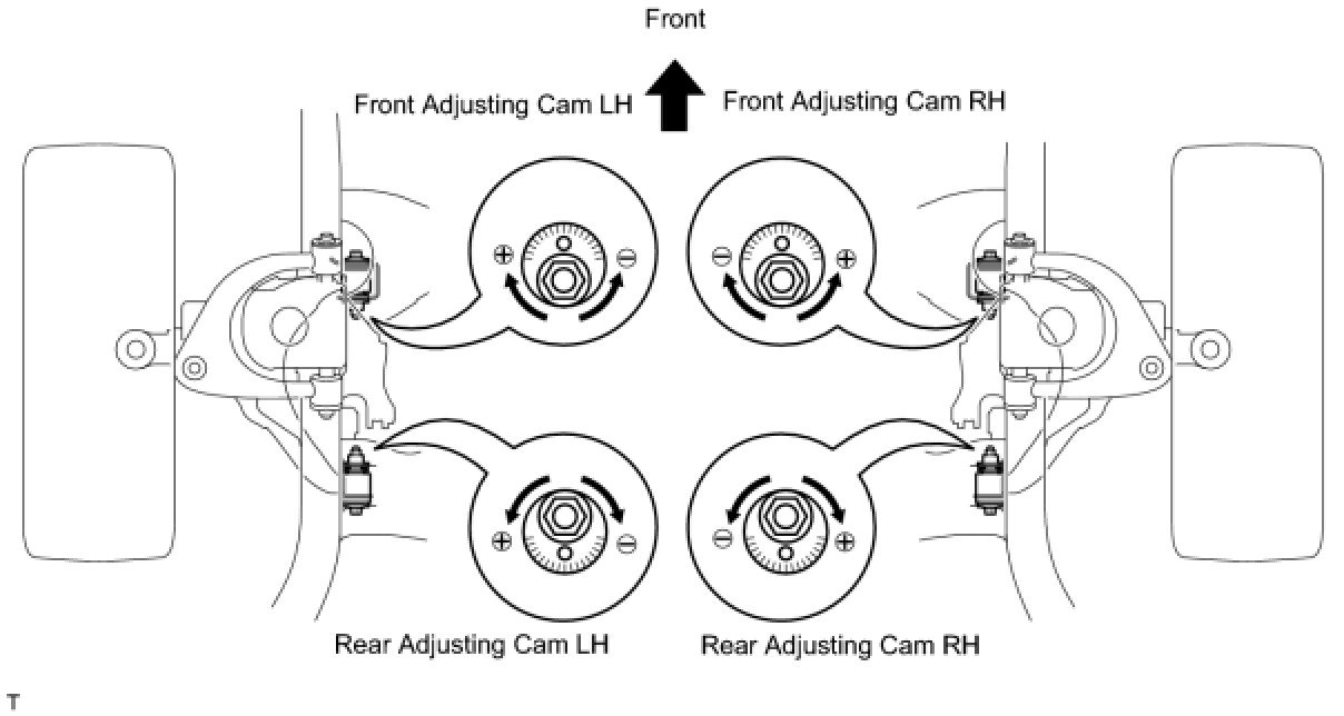 (b) Turn the front adjusting cam and rear adjusting cam in both directions, and adjust the camber and caster to the center value.