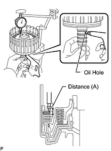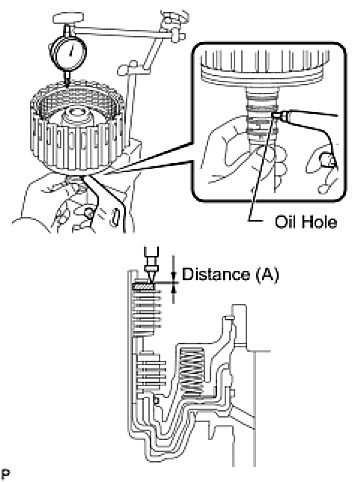 (c) Using a dial indicator, measure the moving distance (A) of the clutch flange at both ends across the diameter while blowing compressed air (196 kPa, 2.0 kgf/cm2, 28 psi) into the oil hole as shown in the illustration. Then choose from the 11 flange thicknesses in the table so that the measured value is within the standard value.