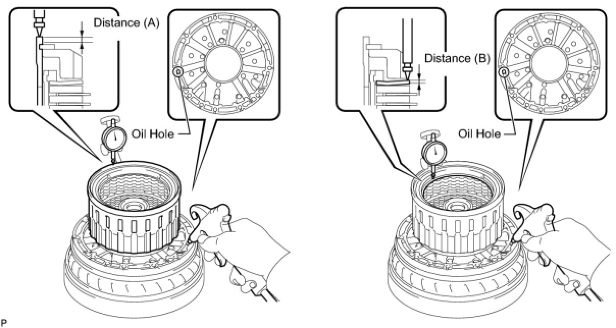 (d) Using a dial indicator, measure the moving distance (A minus B) of the tip of the reverse clutch piston (A) and cushion plate at both ends across the diameter (B) while blowing compressed air (392 kPa, 2.0 kgf/cm2, 57 psi) into the oil hole as shown in the illustration. Then choose from the 12 flange thicknesses in the table so that the measured value is within the standard value.