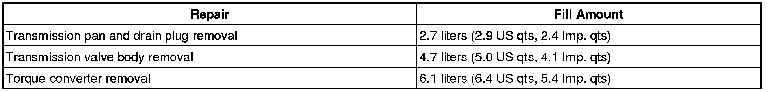 (b) Fill the transmission with the amount of fluid listed in the table below.
