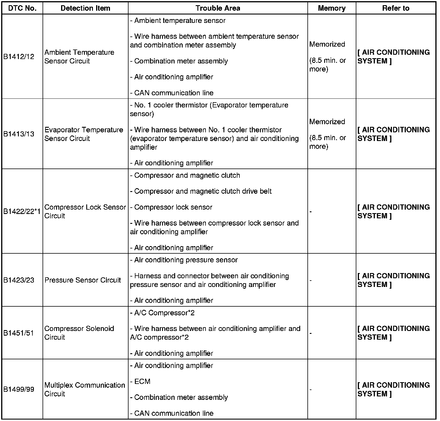 HINT: *1: DTC B1422/22 (Compressor Lock Sensor Circuit) is indicated only for a currently occurring malfunction for 2GR-FE.