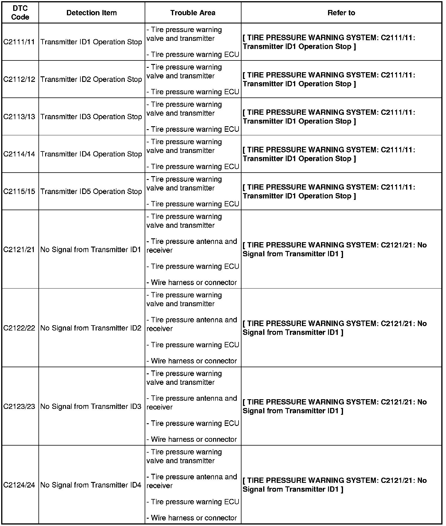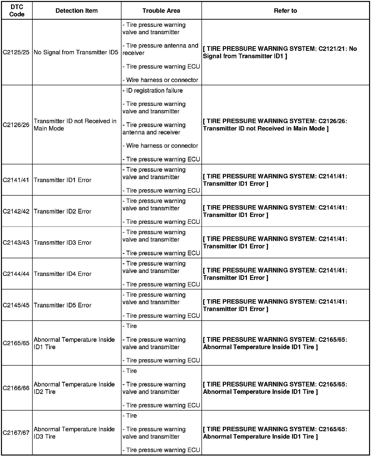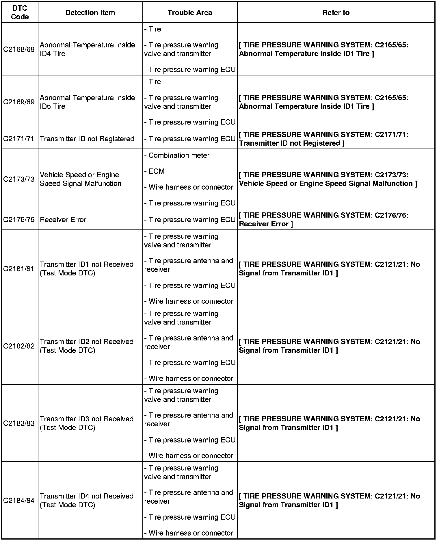 TIRE AND WHEEL: TIRE PRESSURE WARNING SYSTEM: DIAGNOSTIC TROUBLE CODE CHART
