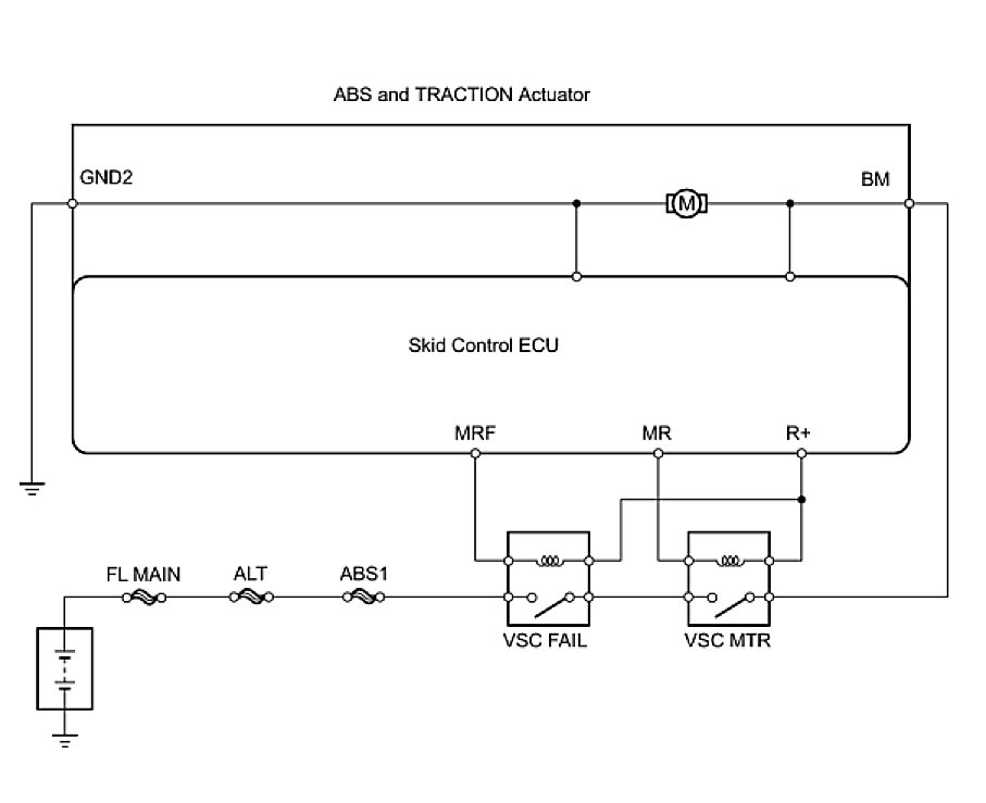 While the ABS, TRAC, VSC, or BA is operating, the skid control ECU turns the VSC FAIL relay on and activates the pump motor in the ABS and TRACTION actuator.