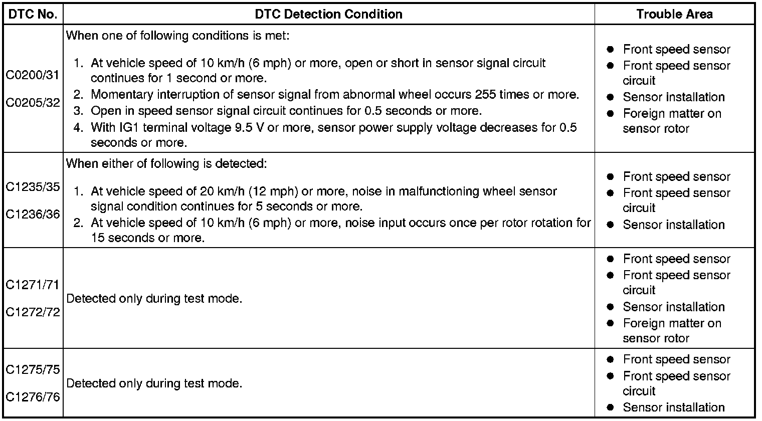 - DTCs C0205/32 and C1236/36 relate to the front speed sensor LH.