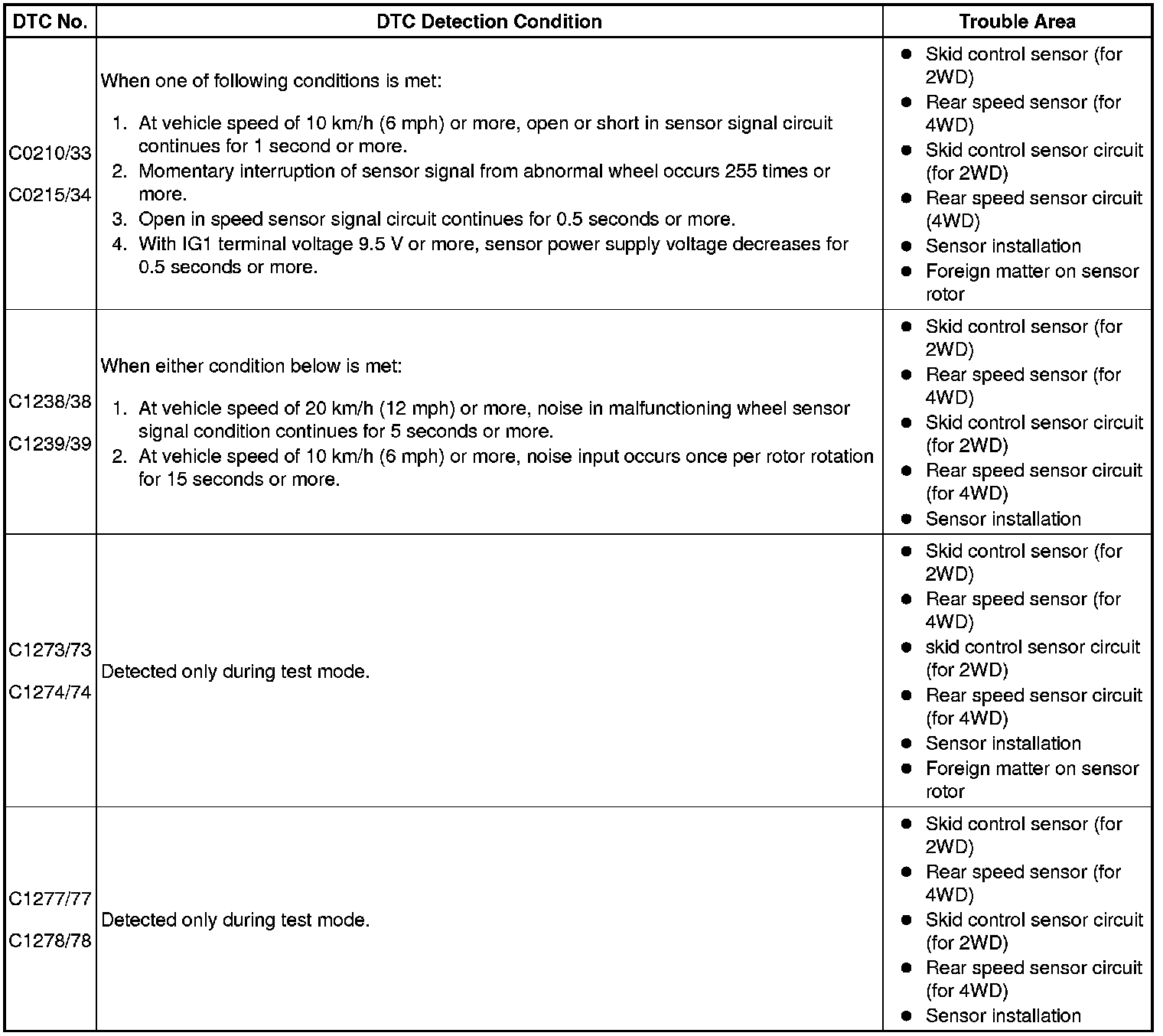 - DTC C0210/33 and C1238/38 relate to the skid control sensor RH.