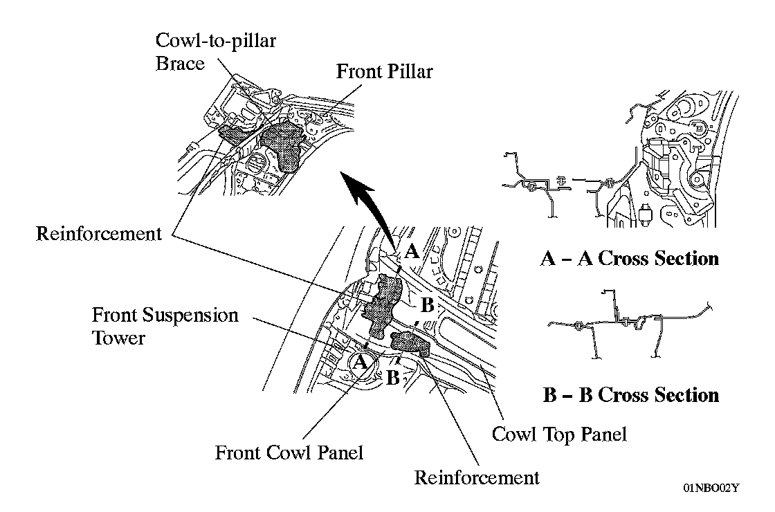 ^ The right and left front suspension towers are joined at the front cowl panel to help ensure the rigidity of the body.